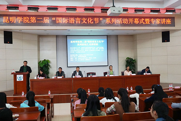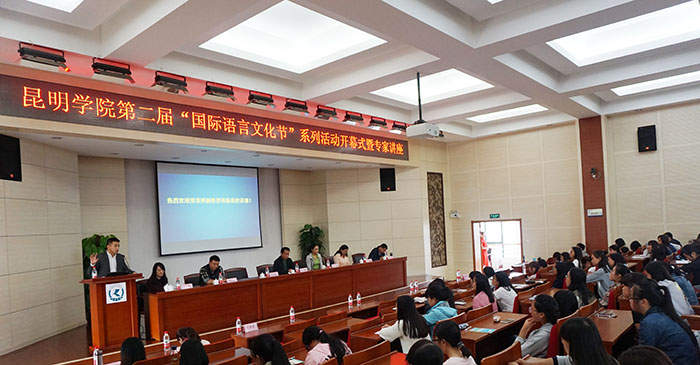 10月14日,beat365英国官方网站第二届“外国语言文化节”开幕式暨名师讲座“English, More Than a Tool”在行政楼D区三楼报告厅如期举行。副校长李翔出席开幕式并致辞。国际交流合作处副处长陈静、外国语学院党总支书记何昊宸、副院长王云秀、党总支副书记马洪波及外国语学院督导昆明理工大学教授王庆奖教授、云南民族大学李强教授等参加开幕式,外国语学院2014级学生代表共计190余人齐聚一堂。开幕式由外国语学院党总支书记何昊宸主持。