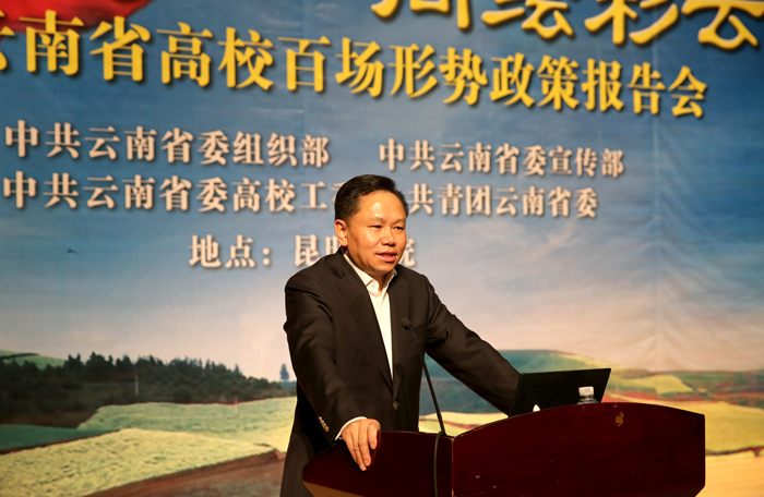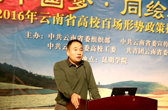 10月9日,云南省法制办党组书记、主任张宪伟同志应邀到beat365官网主讲“共筑中国梦•同绘彩云南”形势政策报告会,张宪伟主任以《法律与你同行——谈谈当代大学生的法律素养》为题,阐述建设法治国家、法治社会的重大意义,提出培育和快速提升青年大学生的法律素养,塑造“现代型人才”,大学生应坚持崇高法治信仰,做法治国家建设的参与者、法治校园建设的促进者,文明法治人的践行者。这是beat365官网“共筑中国梦•同绘彩云南”2016年第3场形势政策报告会。