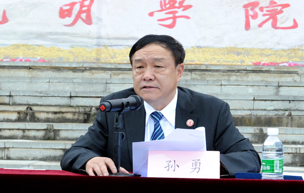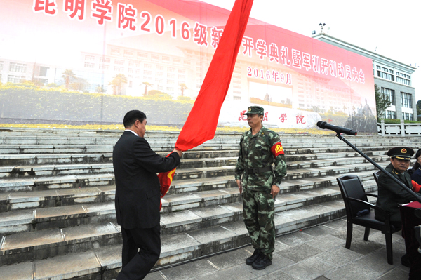 党委副书记孙勇作军训动员讲话,并向军训团授团旗、宣布2016级新生军训开训。副校长郭华主持动员会。