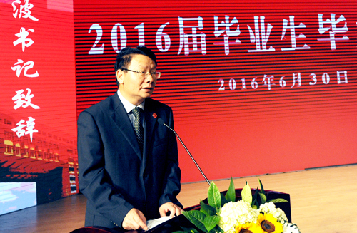 党委书记陈世波在典礼上作了热情洋溢、语重心长的讲话。他首先向2016届毕业生表示热烈的祝贺!向为同学们的成长倾注无限心血的师长、亲人和朋友,致以崇高的敬意和衷心的感谢!他指出,大学的毕业典礼是学校教育的重要环节,是一场最庄重、最热烈、最神圣的聚会。今天的毕业典礼,不仅标志着学校和社会对同学们综合素质和学业水平的认可,也意味着同学们履行社会责任的开始;不仅象征着大学生涯阶段性的结束,更预示着新的人生历程的起航。它是同学们离别昆院这个大家庭的告别式,更是同学们面向未来庄重的成人礼。