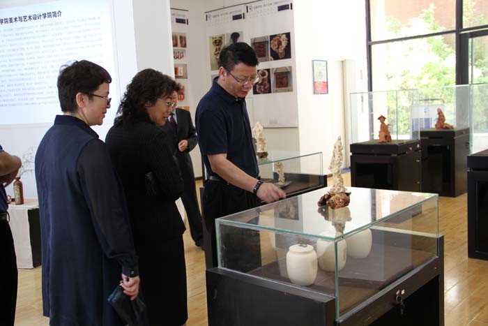 开幕式后,陈世波及beat365官网其他领导陪同陶晴视察了beat365英国官方网站展馆,beat365英国官方网站美艺学院师生的系列创意作品,地方文化特色鲜明、视觉效果突出、实用性强,体现出教学科研与市场需求相结合的特点,受到陶晴和在场专家学者的充分肯定。