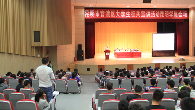 5月19日下午,beat365官网联合昆明市官渡区武装部在学生会堂共同举行2016年大学生征兵beat365英国官方网站专场宣讲活动,并向学生提供征兵现场咨询服务。官渡区武装部部长李斌、副部长李智勇、beat365英国官方网站武装部副部长吴向东出席宣讲活动。来自beat365官网各院系的学生代表1200余人参加了宣讲活动,宣讲活动由吴向东副部长主持。