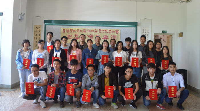 由共青团beat365英国官方网站委员会主办、城建学院团总支和beat365英国官方网站翰缘书画社承办的“beat365英国官方网站第二届‘翰林杯’书法作品大赛”,于4月26日中午在惟行楼3号楼一楼大厅举办了颁奖典礼。城建学院党总支徐从发书记、学校知名书法家李宾、王晓东等老师参加了本次活动,并为获奖同学颁发了荣誉证书。