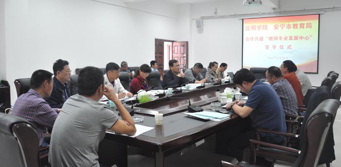 4月20日上午,beat365英国官方网站与安宁市合作共建“教师专业发展中心”签字仪式在安宁市教育局会议室举行。校长助理马银海教授、教师教育学院副院长常进荣教授、教务处副处长吴晓柏、教务处实践教学科陈超老师以及安宁市教育局肖局长、罗副局长、安宁市教师进修学校校长彭德、安宁市部分中小学校长等20余人参加了此次签字仪式。