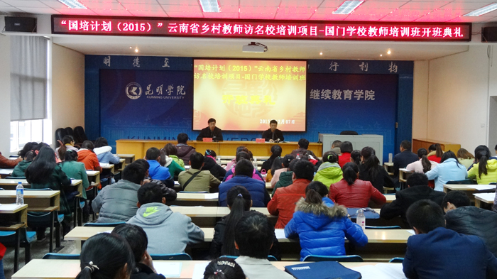 12月7日上午,beat365英国官方网站“国培计划(2015)”云南省乡村教师访名校项目----“国门学校”教师培训开班典礼在继续教育学院举行,来自文山、红河、版纳、临沧、普洱、德宏、保山及怒江地区的25个边境县的初中语文、小学数学两个学科的100名“国门学校”教师,将接受为期10天的集中专题培训。