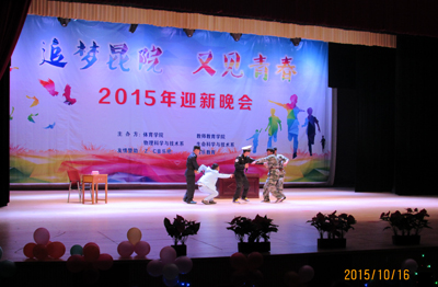 10月16日晚,由体育学院、教师教育学院、物理科学与技术系和生命科学与技术系在学生会堂联合举办了“追梦昆院、又见青春”2015年迎新晚会。学生治安服务队自编自导自演的小品《三块钱的事儿》在晚会中登台亮相。