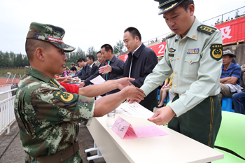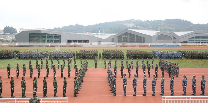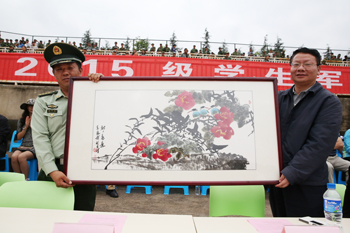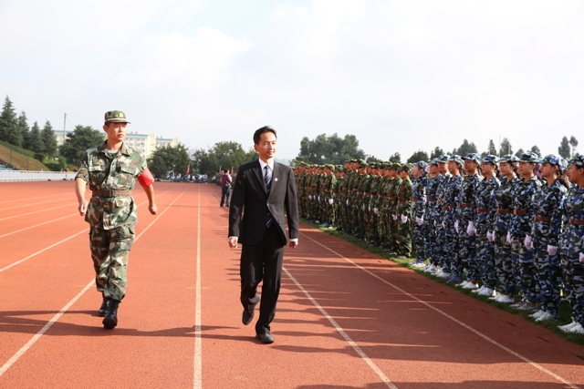 9月11日上午,beat365英国官方网站2015级学生军训汇报表演暨总结表彰大会在学校田径运动场隆重举行。学校党委书记陈世波出席大会并代表学校向承训部队云南武警边防部队士官学校赠送纪念匾额,校长何华检阅军训学生方队。武警边防部队士官学校训练部副部长(大校警衔)赵立志、武警边防部队士官学校装备维修系政委汪发云,学校党委副书记孙勇,党委副书记、纪委书记李媛芬,副校长李翔、熊晶、郭华、董建华出席大会,并同其他与会领导一同为获奖集体和个人颁奖。郭华主持大会。