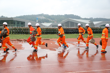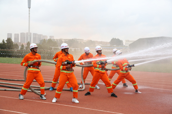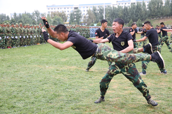 分列式后,军训科目汇报表演开始,集中展示了军训12天以来的训练成果。第一队列方阵带来队列操图案表演,表演动作包括敬礼、跨立、齐步走、正步走、齐步变正步等预定训练科目。令行禁止、潇洒的转身,纵横交叉,组成的“32”图案,蕴意校长对新生的32个赞让大家眼前一亮,有力的身姿让大家为之一振。整齐的动作,饱满的精神,矫健的步伐、准确的口令、嘹亮的声音赢得在场领导和观众热烈的掌声。第二个表演项目是由女生和男生共同组成的方阵展示擒敌拳,整齐刚劲的动作、坚定嘹亮的口号,展示着昆院学子的自信和刚强。第三个项目展示的是擒拿摔术,实摔的倒功、实战的擒敌,过硬的功夫、致敌的招数,男儿的刚强搏得观众连声叫“好”!相续,消防警笛声响起,一辆消防车急速驶入操场,由8名新生和昆明经开区消防大队4名消防员共同完成水罐消防车双干线出三支水枪灭火表演。规范的动作、专业的技能、警示的演练,让学生了解消防,增强学生消防安全意识。