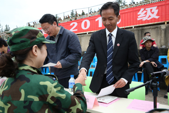 大会在雄壮的国歌声中拉开帷幕。上午9时,全场肃立,迎国旗,行注目礼。何华在赵立志陪同下检阅了2015级学生军训团4590名参训新生组成的受阅方队。受阅方队精神饱满,热情高涨,以严整的军姿、昂扬的精神迎接检阅,随着何校长响亮有力的“同志们好!”、“同志们辛苦了!”的问候,受阅方队“首长好!”、“为人民服务!”嘹亮的口号划破长空,在操场上空此起彼伏,久久回荡。