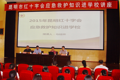 6月16日下午,由昆明市红十字会主办,保卫处协办的应急救护知识讲座在beat365官网惟行楼1501报告厅举行。讲座邀请到中国研究型医院学会心肺复苏学会委员、北京市红十字会应急救护工作指导委员会专家委员马桂林主讲。昆明市红十字会副会长冯浩、备灾中心主任岳巍、组织宣传部部长漆一桦与beat365官网校团委社团、医学院、教师教育学院学生代表以及保卫处干部、保安200余人一起聆听了讲座。讲座由保卫处处长方永昆主持。