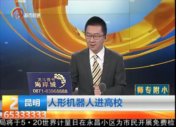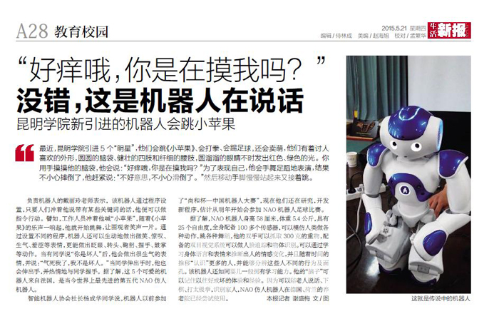beat365官网引进NAO机器人很快受到了媒体的关注,5月18日云南都市频道的都市条形码栏目率先对NAO机器人进行了名为《人形机器人进高校》的新闻专题采访,5月21日生活新报的教育校园栏目也刊登了关于beat365官网智能机器人的专栏报道。
