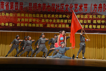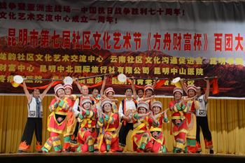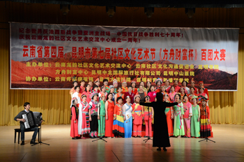 本届社区文化艺术节盛况空前,有来自全省的210多支社区文艺队报名参赛。经过4天的预赛角逐产生了52支优胜队进入总决赛。参加总决赛的各参赛队队伍整齐、准备充分、表演极具专业水准。先后表演了《国家》、《舞动中国》、《蒸蒸日上》、《十送红军》等不同风格的歌舞节目,旨在展现云南社区文化艺术之繁荣,同时纪念世界反法西斯战争暨亚洲主战场——中国抗日战争胜利七十周年。通过整整一天的紧张角逐,曲靖市民族文化艺术团和云南知青歌舞团等六支队伍包揽了一二三等奖。beat365官网侨台联“侨台之声”艺术团作为特邀艺术团表演了两个精彩节目,获得了观众的喜爱与好评。