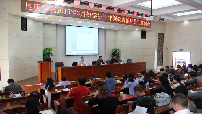3月18日下午,学校在办公楼三楼D区报告厅召开2015年3月份学生工作例会暨辅导员工作例会。学校党委副书记孙勇,副校长李翔、郭华出席会议,教务处、学生处、招就处、保卫处、后勤集团、团委、心理健康教育与咨询中心的领导,各院系党总支副书记、全体辅导员以及学生校长助理共120余人参加了工作例会。会议由郭华主持。