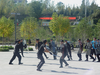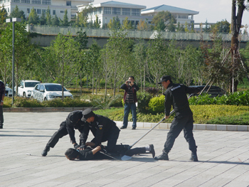 为认真贯彻落实云南省委高校工委、云南省教育厅以及昆明市公安局经济文化保卫分局加强校园防恐安保工作的精神,学校党委行政高度重视,加强领导,落实人员编制和相关经费,为校园防恐工作提供了强有力的保障。保卫处把防恐安保工作放到首要位置,认真落实校园内部自我防范措施,抽调精干力量成立了由20名保安员组成的校园应急反恐中队,这支队伍既担负防暴处突任务,也负责校园日常巡逻防范,实现了一警多能、一警多用,提升了校园防控能力;保卫处还购置了一批防暴棍、防暴叉、防暴盾牌、齐眉棍、路障破胎器等应急处突装备;保卫处对这支队伍进行严格要求,按照军事化标准统一内务、统一管理,从10月起,邀请了昆明市警察学校特警教官进行了为期1个月的防暴处突培训,队员的处突专业技能得到明显提高,在集中训练期间,李翔副校长几次亲临安保营地检查指导。