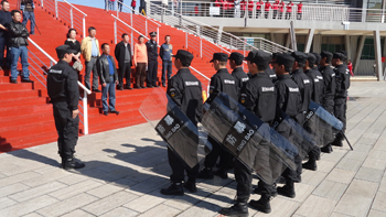 应急反恐中队进行了警棍盾牌操、防暴队形及模拟反恐处突表演。在模拟处置校园群体斗殴治安事件时,校园110接警后发出处置指令,就近保安岗位接警后迅速到场控制,随后应急反恐队员到达现场,将斗殴双方进行有效隔离,稳控事态;在模拟处置校外人员入校暴力袭击“学生”突发事件时,应急反恐中队接警后迅速集结出动,携带应急处突装备第一时间抵达现场,一部份队员手持盾牌组成人墙保护现场学生避免受到伤害,另一部分队员按战术配合用防暴棍和防暴盾牌将暴徒围堵,用防暴脚叉控制住“暴徒”,成功制服“暴徒”。队员们高昂的士气,过硬的战术,嘹亮的口号,实战的场景,吸引了师生驻足观看,不时报以热烈的掌声。