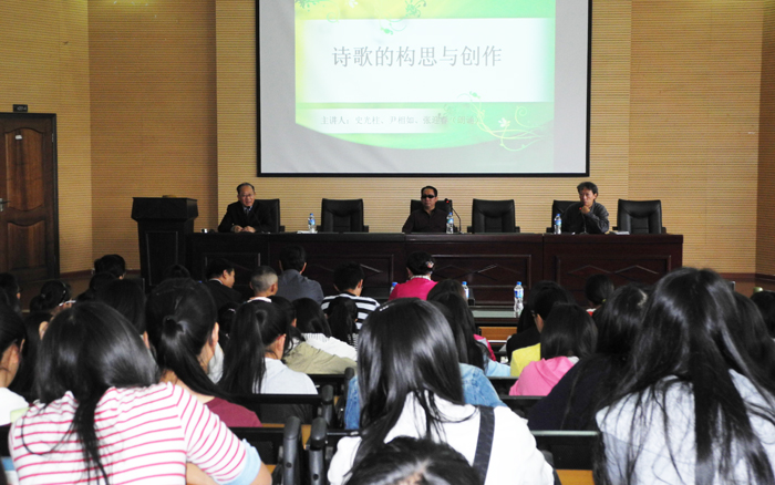 10月21日下午,人文学院请来一级战斗英雄史光柱先生为人文学院14级新生讲授“诗歌的构思与创作”。本次讲座由三位老师共同主持,张迎春老师诵读诗作,史光柱先生述说诗作的构思与创作过程,尹相如教授评点诗歌并阐发创作领悟,形式新颖,感受真切。讲座历时三个小时,120余名学生听得津津有味。参与讲座的还有人文学院院长詹七一,人文学院部分老师等。