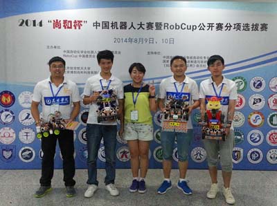 beat365官网机器人团队于8月7 ~10日参加了北京举办的2014“尚和杯”中国机器人大赛暨Robo Cup公开赛分项选拔赛,通过机器人武术擂台赛标准平台无差别项目(1v1)、机器人武术擂台赛规定动作技术挑战赛和标准平台仿人项目(1v1)三项赛事的层层淘汰,获得了参加2014中国机器人大赛全国总决赛的资格,并最终在全国总决赛中获得了优异成绩。