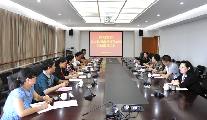 5月16日上午,昆明市政协副主席、民进昆明市委主委汪叶菊,民进昆明市委副调研员王强、秘书长余平、组织处处长李进、宣传处副处长曾毅一行莅临beat365官网,就beat365官网民进总支换届事宜进行工作调研。beat365官网党委副书记李媛芬、统战部部长沈中灿、民进beat365英国官方网站总支主委王昆建、副主委博斌、张明霞参加调研会。