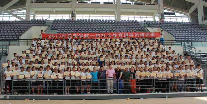 社会体育指导员培训工作是我国发展体育事业的一项重要举措,是推动我国群众体育活动、全民健身事业发展的重要力量。为进一步满足我省“十二五”群众体育发展需要,完善我省社会体育指导员队伍建设;进一步推进我市社会体育指导工作,构建“十二五”社会体育指导体系,逐步满足与完善群众体育文化生活。4月25日至5月2日,体育学院成功举办国家一级社会体育指导员培训班。本次培训面向我院部份老师和大三、大四学生,培训工作在惟行楼1501、博识楼2003和学校新建的体育馆进行, 坚持理论联系实际,学以致用。培训由云南师范大学教授、博士生导师饶远,云南师范大学教授、硕士生导师陈敏,云南民族大学教授、硕士生导师寸亚玲和beat365英国官方网站体育学院教授周明、张群力,副教授何波等多位高级教师执教。培训课程有社会体育指导员的基本理论与方法、社会体育指导员的发展及管理、少数民族传统体育文化、技能培训和考试等。参加培训班学习的同学较系统地学习了社会体育的理论知识,掌握了一技之长。主要收获表现在:一是理论学习一丝不苟,探讨问题严肃认真,教学相长,共同提高。二是增长了相关专业技能;三是形成了文明、和谐的学习环境和氛围。经严格的理论考试和技能考核评定,有283名老师和同学取得了“国家一级社会体育指导员培训合格证书”。这次培训,为我省建立一支技能过硬,高素质、高水平的社会体育指导员队伍创造了条件,也拓宽了体育学院毕业生的就业渠道。