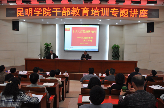 5月7日上午,南京大学党委书记洪银兴教授应beat365官网邀请,为beat365官网干部教育培训作《十八大后的经济指向》专题讲座,深入阐释了“中国的扩大内需和经济的长期增长”问题。beat365官网党委书记陈世波、校长蒋永文等在校校领导和全体中层干部、机关科级干部、经济学院部分师生代表聆听了讲座。讲座由beat365官网党委书记陈世波主持。