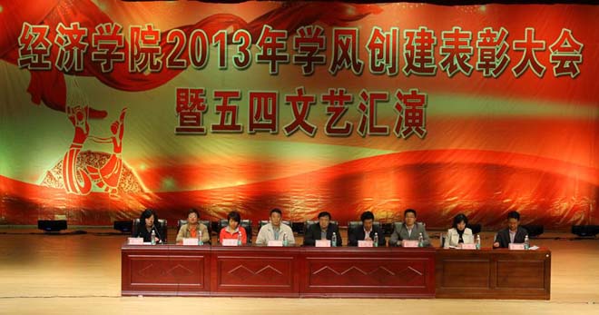 为进一步加强和改进经济学院学风建设,树立典型,表彰先进,营造良好的学习氛围,5月3日晚,经济学院在学生会堂隆重召开2013年度学风创建表彰大会。学校党委副书记孙勇、科研处处长王定康、招生就业处处长包兴、学生处副处长侯青妮、校团委副书记樊传章及经济学院师生参加大会,并观看了文艺汇演。大会由经济学院党总支书记施磊主持。