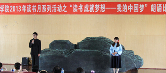 4月25日下午,“读书成就梦想——我的中国梦”朗诵比赛在惟行楼1501报告厅举行。本次朗诵比赛是为了深入学习宣传贯彻党的十八大精神,使学生养成博览群书的好习惯,激励学生多读书、勤思考、善表达,在朗诵优美诗文中,唤起对中国梦的畅想。比赛由学生工作部(处)和人文学院共同主办。