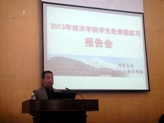 会上,经济学院党总支施磊书记对经济学院学生赴泰实习工作进行了总结,介绍了目前与泰国开展的合作项目推进情况,强调了组织学生赴泰实习的重要意义。学院第二批赴泰实习的同学分三组分别从“中泰文化差异”、“中泰消费习惯差异”和“中泰连锁店的发展差异”三个方面以ppt的方式,图文并茂地专题汇报了他们的实习成果和收获。经济学院博斌院长充分肯定了学生在赴泰实习中所取得的丰硕成果,表示要在学校的支持下,克服困难,继续组织开展好第三批学生赴泰实习工作。