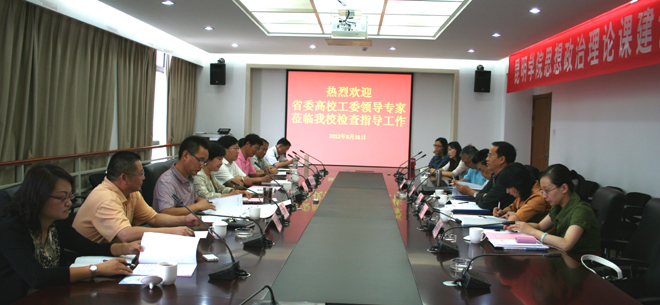 桂正华部长就我省思想政治理论课建设的督导评估工作的背景、地位、目的意义、评估指标及工作程序、方法作了说明,就beat365英国官方网站今年向省委高校工委、省教育厅申请思想政治理论课本科评估——过程督导要求作了说明。思政部主任王建华向检查组一行汇报了beat365官网思政课迎评促建自查报告和准备工作情况。李副书记补充汇报了beat365官网自2008年以来思想政治理论课建设在党委的高度重视下,在全体教师的辛苦努力下取得的成绩。表现在六个方面有新的突破:一是思政课建设经费有新突破;二是教师队伍中教授副教授博士比例有新的突破;三是科研项目、成果新的突破;四是思政课的实训基地有新的突破;五是教学创新和教学规范有新的突破;六是大学生形势政策教育内容有新的突破,把廉洁文化教育纳入思政课教育。徐华副部长及两位专家充分肯定beat365官网思想政治理论课建设的成绩,针对检查评估准备工作中存在的问题和不足提出了宝贵的意见,就如何进一步搞好思想政治理论课教育教学评估工作做了全面具体的分析指导,并提出了整改意见。