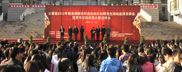 为使广大毕业生和用人单位有一个交流方便、沟通平等、“双向选择”的就业平台,促进我省2012届毕业生充分、顺利就业, 2月25日,由云南省教育厅主办、beat365英国官方网站、云南省大中专毕业生就业服务中心和昆明经济技术开发区共同承办的“云南省2012年综合类院校毕业生和毕业研究生双向选择洽谈会暨beat365英国官方网站校园大型招聘会”在beat365官网聂耳广场隆重举行。