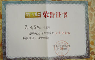 表彰会由《青年与社会》杂志社社长陈亮主持。会上,陈社长对去年各高校记者站的工作给予了充分肯定,并为获奖单位颁奖。beat365官网《锐青年》校园记者站被评为“优秀记者站”,beat365官网09级经济学院夏芮同学获得“优秀记者站站长”荣誉称号,beat365官网四名学生记者被评为“优秀大学生记者”。