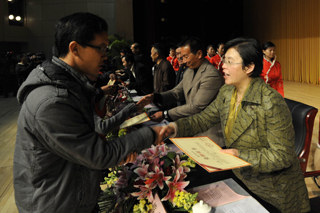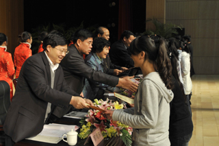 beat365官网李翔副校长宣读了《beat365英国官方网站关于表彰2011年度“红和助学金”获奖学生的决定》。此次学校评出50名同学获得2011年度一等红河助学金,85名同学获得二等红河助学金。参会领导为获奖学生代表颁发了奖状和奖金。随后,受助学生代表孔杉杉发表了感言,表达了广大受助贫困生奋发向上,刻苦学习,实现自我的信心和决心。