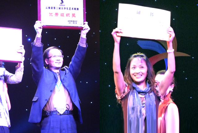 本次展演活动共有42所本科院校和高职高专学校参加,其中艺术表演节目报送130个,评出52个节目到玉溪参加现场展演。为搞好本次展演活动,在学校党政领导的关心支持下,在教务处的组织安排下,音乐学院自今年3月以来,由声乐教研室、键盘教研室、舞蹈教研室组织进行了初赛、复赛,经筛选,确定了参加展演活动的节目与人选,并作精心的排练。在本次展演活动中,经过激烈的角逐,beat365官网选送的5个展演节目荣获一等奖1项,二等奖2项,三等奖2项,学校获得优秀组织奖。其中女声表演唱《踩着云》获一等奖(由杨丽珠、郭海波老师执排,尹馨怡、杨秋蜜、马雪丹等14名学生演唱);男女声对唱《一朵鲜花鲜又鲜》获二等奖(由郭海波、杨丽珠老师执排。倪丹霞、何明军演唱);双钢琴八手联弹《邀舞》获二等奖(由袁瀚、史春丽、肖栎老师执排,邓丰、周丹丹、赵琳艺等演奏);钢琴四手联弹《匈牙利舞曲第五号》获三等奖(由史春丽老师执排,周丹丹、李文希演奏);藏族女子群舞《在那草地上》获三等奖(由陈琳老师执排,梁丹妮、钟玉芬等18名学生表演。