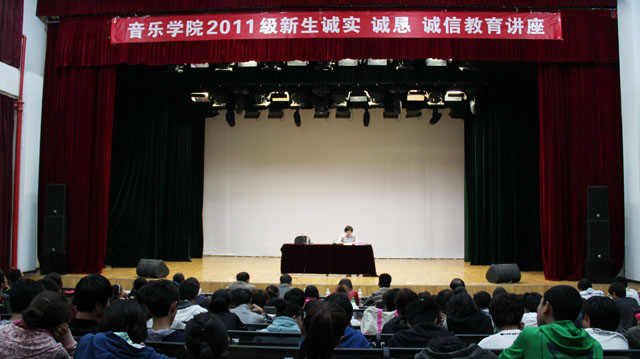 9月29日晚,学校党委副书记、纪委书记李媛芬在音乐实践教室为音乐学院2011级新生作“诚实、诚恳、诚信”教育讲座。学校纪委副书记、监察审计处处长施磊、纪委办、宣传部的相关人员与音乐学院科以上干部、辅导员、新生班班主任及全体2011级新生聆听了讲座。讲座由音乐学院党总支副书记王亚越主持。