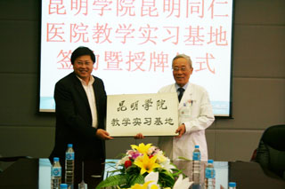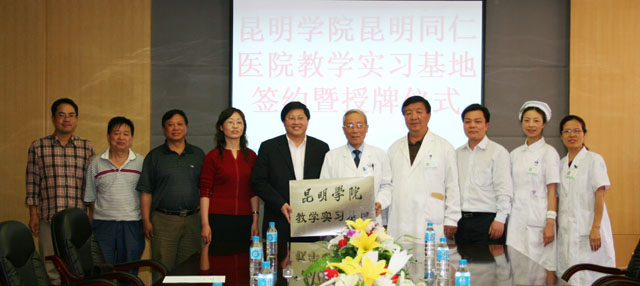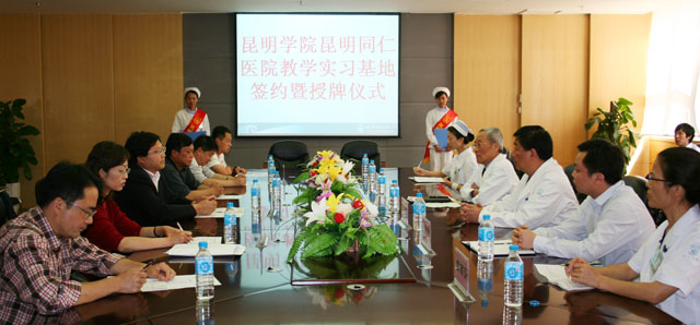 会上,罗明东副校长与蔺锡侯院长就教学实习基地合作协议签字,罗副校长并向蔺院长授牌。这标志着beat365官网医学院与昆明同仁医院的合作正式启动,beat365官网今年7月份起,首批护理专业学生将赴昆明同仁医院,开始长达10个月的实习期。beat365官网医学院的学生又多了一条实战渠道和场地。