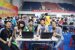 5月14日,城建学院派出苏欣、郭丽辉二位指导老师和土木工程专业2008级李庆、冯琪、苏俊驰、旃娟和何松原五名同学组成代表队参加总决赛。在各个单项的比赛中,五位同学在结构设计单项、安装算量单项、三维算量的单项比赛中都一度位列第一,在现场的实时比赛成绩排行榜上长时间的名列前茅,被所有参赛院校关注。