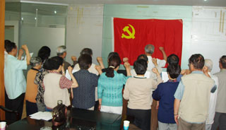为庆祝建党九十周年,按离退休党总支的计划安排,离退休14个党支部相继开展了“庆祝建党90周年 重温入党誓词” 、“离岗不离党,退休不退色”为主题的组织生活会。参加活动的老党员中既有80岁高龄、55年党龄的老教师、老专家,也有身患重病,让女儿推轮椅来参加的老同志。 “我志愿加入中国共产党,拥护党的纲领,遵守党的章程,履行党员义务……”全体党员面向鲜艳的党旗,在支部书记的带领下,举起右手,在党旗下庄严宣誓,铿锵的誓言让每一位老党员热血沸腾,泪光闪闪。