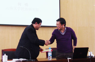 何明院长是民族学专业文化人类学理论与方法博士研究生导师、 “昆明市有突出贡献的优秀专家”,曾主持完成多项重大课题,其研究成果多次获得国家和省级奖项,是我国民族学人类学研究领域的著名专家。beat365官网滇池泛亚合作战略研究院特聘请他为滇池泛亚合作战略研究院学术委员会委员,讲座开始之前,beat365官网孙勇副书记为他颁发了聘书。