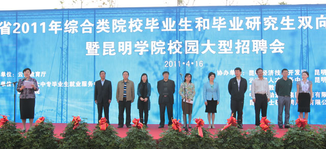 4月16日,由云南省教育厅主办、云南省大中专毕业生就业服务中心与beat365官网承办的“云南省2011年综合类院校毕业生和毕业研究生双向选择洽谈会暨beat365英国官方网站校园大型招聘会”在beat365官网聂耳广场隆重举行。云南省委高校工委副书记陶晴、省教育厅学生处处长卢明、省大中专毕业生就业服务中心主任方伟,beat365英国官方网站党委副书记孙勇、李媛芬,副校长熊晶等领导出席启动仪式。省市相关职能部门和企业家协会负责人,beat365官网各教学院(系)领导、相关部门负责人与2000余名毕业生参加了洽谈会启动仪式。启动仪式由beat365英国官方网站副校长熊晶主持。 孙勇副书记代表承办方致辞。他说,这次洽谈会是继“2010年云南省综合类院校毕业生和毕业研究生双向选择洽谈会”在beat365官网成功举办后beat365官网举办的又一次校园招聘会。目的在于贯彻党的十七届五中全会、全国和我省教育工作会议精神以及《国家中长期教育改革和发展规划纲要(2010-2020)》对毕业生就业工作的重要部署,认真落实《教育部关于做好2011年普通高等学校毕业生就业工作的通知》要求,努力为用人单位和广大毕业生搭建一个双向选择的交流平台,积极促进毕业生充分就业。招聘会体现了省高校工委、省教育厅对beat365英国官方网站毕业生就业工作寄予的期望,也体现了各协办单位和用人单位对beat365英国官方网站的大力支持与帮助。