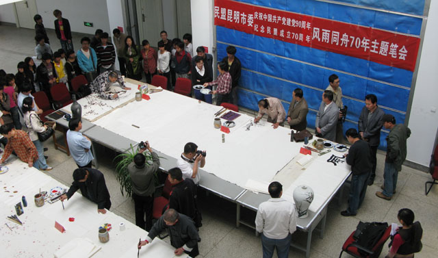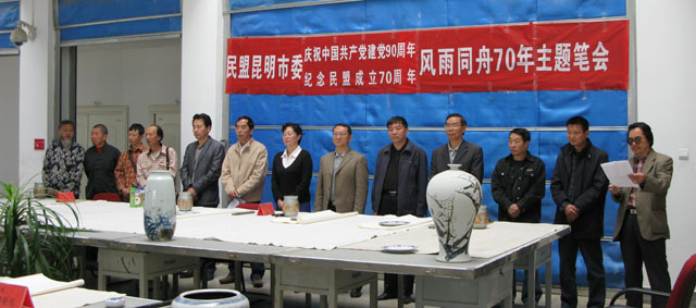 4月20日上午,美术与艺术设计学院教学楼大厅内群贤毕至,少长贤集,翰墨飘香、欢声笑语,洋溢在一片热烈而祥和的气氛之中。“民盟昆明市委庆祝中国共产党建党90周年、民盟成立70周年——风雨同舟主题笔会”在这里隆重举行。 出席开幕式的领导有:云南省政协副秘书长、民盟云南省委副主委徐宁、昆明市人大常委会副主任、民盟昆明市委主委夏静,中共昆明市委统战部调研员贾天鹏、党派处处长许广,中共beat365英国官方网站统战部部长张云权,市政协常委、民盟昆明市委副主委冯刚,市人大代表、民盟昆明市委副主委、beat365英国官方网站美术与艺术设计学院院长武新文。 应邀出席笔会的书画家有:云南省美术家协会副主席、云南画院副院长、云南美术馆副馆长、国家一级美术师郭游,云南书法家协会常务副主席、国家一级美术师孙源,云南省艺术教育委员会常务委员、beat365英国官方网站美术与艺术设计学院院长武新文,云南画院著名画家李平、杨正国,民盟市委知名画家黄片石、朱仲元、魏祖右。 民盟昆明市委机关的有关干部和美术与艺术设计学院师生近100人参加了开幕式。