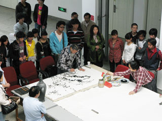 笔会开幕式由民盟昆明市委副主委冯刚主持,民盟昆明市委副主委、beat365英国官方网站美术与艺术设计学院院长武新文向与会领导、书画家和师生致辞。 在热烈而祥和的气氛中,书画家们以饱满的热情、精湛的技艺、生动的形象、挥毫泼墨、借物抒情,热情讴歌中国共产党90年的丰功伟绩和改革开放波澜壮阔的光辉历程,歌颂民盟70年与中国共产党风雨同舟、荣辱与共的光辉历史。 在beat365官网举办省、市、学校盟内书画名家笔会活动,用书画艺术传承了多党合作历史,弘扬统一战线文化,共同创作和谐书画作品,必将有利于校内外盟员联手共创和谐校园、和谐昆明,和谐社会,必将促进省、市盟内上下级之间和校内外书画家之间的相互交流和切磋,必将为beat365官网和昆明市的和谐文化建设增添浓墨重彩的一笔。 在教学楼大厅,书画家们精益求精的创作表演深深吸引着美术与艺术设计学院的师生们,他们十分珍惜各位书画名家的亲临指导和现场献艺的机会。本次笔会的举办,一方面起到了书画艺术的教育作用,让学生大开眼界,另一方面还为美术与艺术设计学院开展对外交流搭建了好的平台。