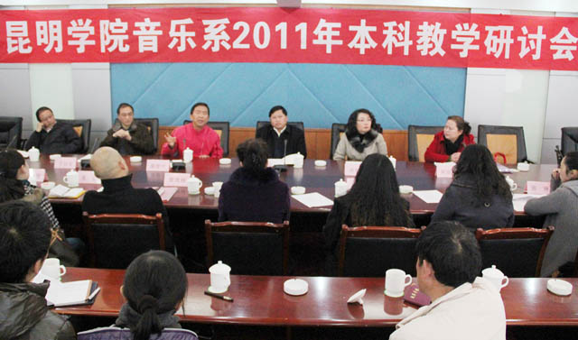 近日,音乐系召开2011年本科教学研讨会,就开办音乐学本科专业教学以来的基本情况、教学工作中存在的主要困难和问题等内容进行全面总结和深入研讨。学院罗明东副院长、教务处郝旭霞处长及云南艺术学院文华学院原院长、省级教学名师康建中教授、云南省教育科学研究院体育艺术研究室王信东副主任应邀莅临会议作指导。会议由系主任靳丽芬教授主持,系党总支副书记王耀勇及全体教职工40余人参加会议研讨。