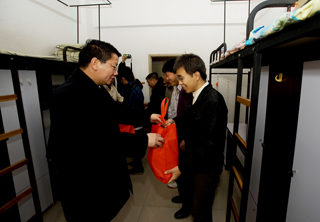 1月26日下午,我院陈世波院长率孙勇副书记、李媛芬副书记、熊晶副院长等院领导深入澄明苑学生宿舍,专门看望慰问了我院今年春节不能回家过年的留校学生代表,向同学们转达了学院党委、行政及全院干部、教师对留校生的亲切问候与关切,并亲手给同学们每人一份过年礼包。