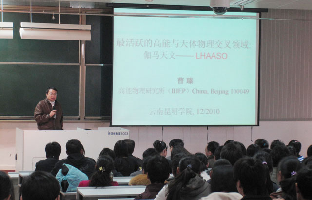 曹臻研究员的演讲内容丰富,从高能宇宙射线的发现及对其探索的历史开始,介绍了宇宙线射线的探测技术,阐述了宇宙射线源与伽马天文学的关联、伽马天文学领域的探测方法以及国际伽马天文学观测实验和现状,最后还专门详细介绍了中国国际宇宙线观测站—西藏羊八井观测站现有两个实验的概况以及取得的成果,以及羊八井观测站未来的实验计划——大型高海拔空气簇射观测站(LHAASO)项目。