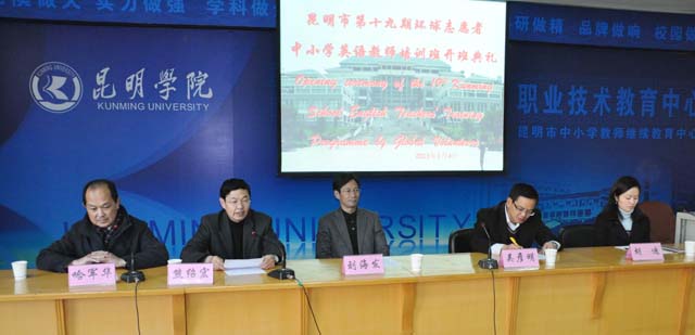 在1月4日上午的师生见面会上,刘海发副院长代表beat365英国官方网站对来自大洋彼岸的志愿者表示欢迎,对志愿者崇高的无私奉献精神表示敬意。刘副院长深情地回忆了69年前在昆明建立的以陈纳德将军为首的中国空军美国志愿援华航空队(飞虎队)开辟驼峰航线,无私帮助中国人民抗击日本侵略者的伟大壮举。他还阐述了昆明在建设面向南亚、东南亚桥头堡过程中,国际文化交流和英语教育的重要性。昆明市教育局师训处处长吴彦明、学院职教中心主任熊绍宏、对外合作交流处主持工作的哈军华副处长等出席欢迎仪式。开班典礼结束后,与会领导和参训学员合影留念。