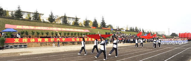 在各院系23支代表队入场后,全体起立,奏唱中华人民共和国国歌。陈世波院长兼运动会组委会主任致开幕辞。他指出,体育运动水平是一个国家文明进步的标志,学校体育运动是贯彻党的教育方针,培养全民发展高素质人才必不可少的全民体育运动的一部分。我院举办运动会不仅是为了检验我院体育教学成果和体育运动的水平,更是充分展示我院师生竞技水平和精神风貌,扩大学院影响的举措。运动会的举办,将会增强学院凝聚力,激发广大师生的拼搏精神、竞争意识和团结友谊,丰富校园生活,促进校园文化建设,为学院的发展注入了新的活力。在我院搬入新校园后,站在新起点,学院希望全院师生进一步弘扬更高、更快、更强的体育精神,加快学院内涵建设和跨越式发展。此次运动会,希望全体运动员严格遵守规则,发扬顽强拼搏、团结奋斗的精神,赛出竞技水平、赛出道德风尚、赛出团结友谊!