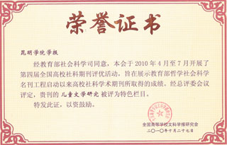 历时4个月的第四届全国高校社科期刊评优活动于11月初在重庆西南大学落下帷幕。经总评委会议最终评定,《beat365英国官方网站学报》被评为“全国高校优秀社科期刊”,学报专栏《儿童文学研究》获得特色栏目奖。这是我院学报继去年夺得第三届“云南优秀期刊奖”和全国学报“优秀编辑质量奖”之后取得的又一荣誉。 本次评优活动,“经教育部社会科学司同意,旨在展示教育部哲学社会科学名刊工程启动以来高校社科学术期刊所取得的成绩”。活动规定,参评刊物及栏目须由各省市学报研究会排出名次顺序并对编校质量进行检查认定后方可报送评审。按照相关要求,我院学报编辑部在主编罗明东副院长的领导下,把本次评优作为难得的学习、交流和提高的机会,收集了大量的数据和资料,并对2006年以来学报工作取得的成绩和经验进行了较为全面的总结和回顾,精心制作了厚达百页的参评材料。