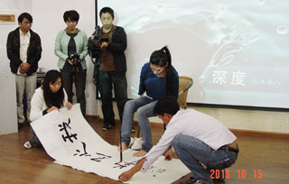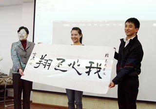 讲座接近尾声时,雷庆瑶用脚书写了“我心飞翔”的毛笔字幅,并将这幅珍贵的书法作品赠送给beat365英国官方网站。熊晶副院长代表学院接受了这份特别礼物。