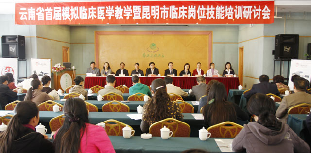 我院医学院与昆明市护理学会、云南省中等医学教育研究室共同主办了云南省首届医学模拟教学暨昆明市临床岗位技能培训研讨会,会议于2010年10月23日开幕,由医学院主持工作副院长余珊致开幕词,beat365英国官方网站主管教学副院长罗明东出席会议并讲话。
