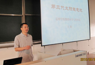 王海博士从当今世界的能源危机及日益严峻的环境问题入手,展开了由此将带来的新技术革命和可持续发展的低碳和绿色经济等的发展趋势,引出太阳能作为取之不尽、用之不竭的可再生清洁能源,在全球长期能源战略中替代传统能源将成为必然的趋势。他在讲座中重点讲解了第三代太阳能电池的研发背景、历程及最新的进展以及王海博士在英国时做的主要研究和成果。