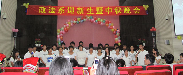 9月17日晚,政法系在新校园模拟法庭举办迎新生暨庆中秋晚会。为了欢迎新同学,让同学们在新校园度过一个师生团员、欢快的中秋节,在政法系党总支、行政的领导支持下,经过系团总支、学生会的积极准备,举办了一场丰富多彩、情意深切的主题晚会。